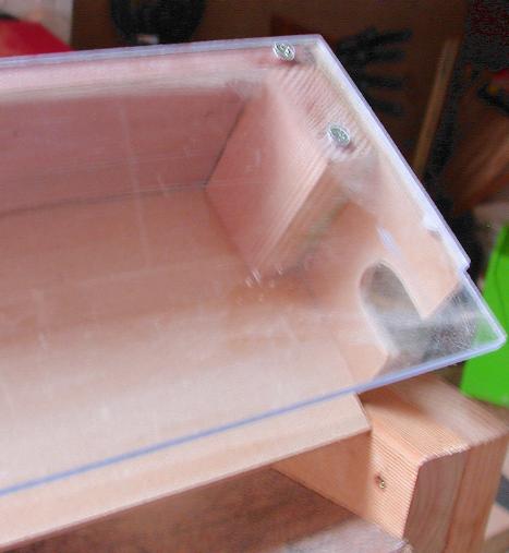 The dust hood has a plexiglass front window so I can inspect the condition of the sandpaper without removing it. The back and sides are thin MDF poster-board, and the top is a bit of Rimu. Sorry it's a bit out of focus.