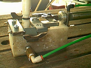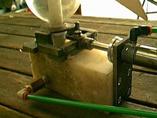 of his launcher mechanism. They show a pair of jaws that fold inwards to surround the bottle above the flange, and a welded fork that holds them in. The fork is withdrawn by a pneumatic cylinder.