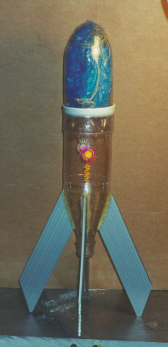 The rocket is made of 2 Dr.Pepper bottles. 1 for pressure, 1 for the nose cone. The fins are Cloroplast glued on with PLP . It works really well and holds up just fine, I don't think I am going to use balsa any more as the Cloroplast is just too much stronger for a 25% weight penalty. True, you can't streamline the edges of the Cloroplast, but, the advantages have me sold for everything but the most hardcore altitude attempts.